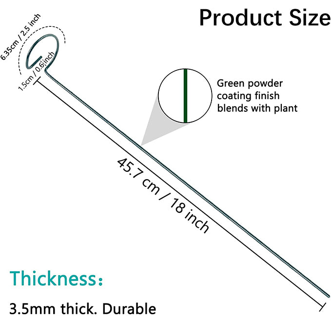 Each pack contains 12 plant support stakes. Each stake measures 45 cm in height, with a top ring diameter of 6.4 cm. Suitable for supporting a wide range of indoor and outdoor plants.