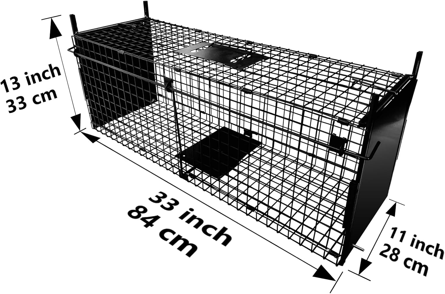 This animal trap cage measures 32 inches (80 cm) long, 11 inches (27 cm) wide and 13 inches (33 cm) high. It’s designed to safely catch target animals without making them feel cramped or stressed. The roomy interior comfortably accommodates animals of different sizes.Versatile Use: