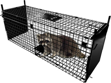 Made from thick, heavy-duty wire mesh, this folding raccoon trap is built to last. The sturdy wire resists bites and impacts without bending or breaking. Finished with a black rust-resistant coating, it offers excellent protection against corrosion and performs reliably in all weather conditions.